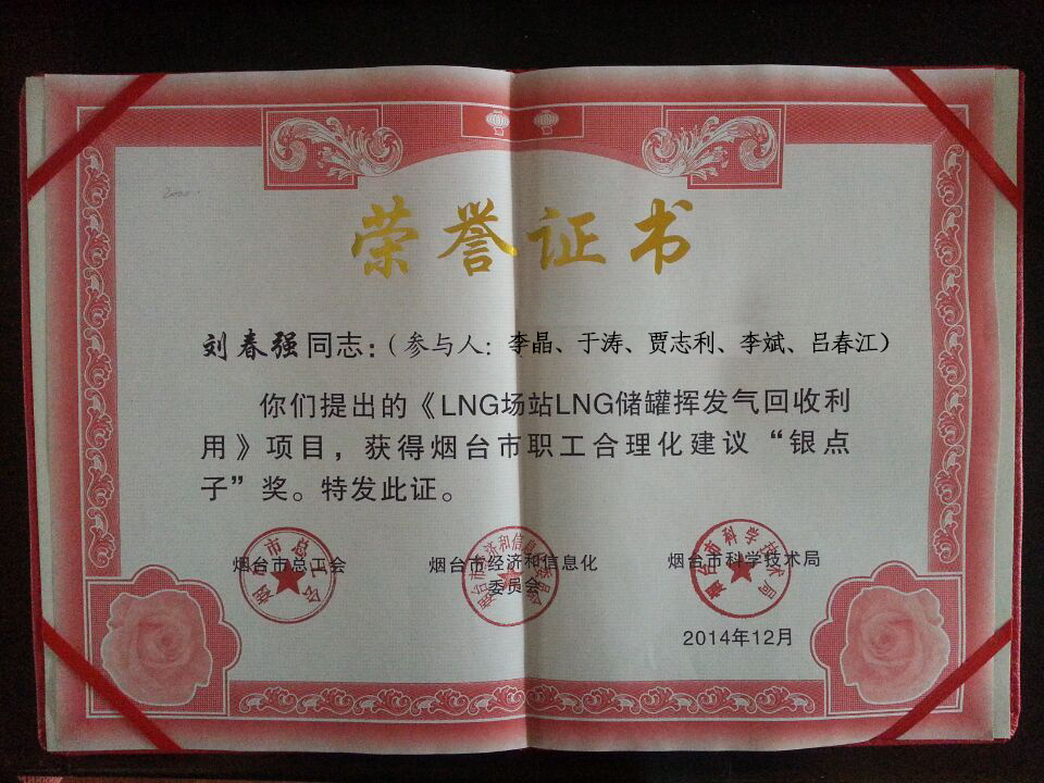 近日,由市总工会、市经信委、市科技局联合开展的“为转调升级出点子,为创新发展献计策”职工合理化建议活动评审结果揭晓,我公司选送的由刘春强等人负责输送的《LNG场站LNG储灌挥发气回收利用》项目喜获烟台市职工合理化建议“银点子”奖。
