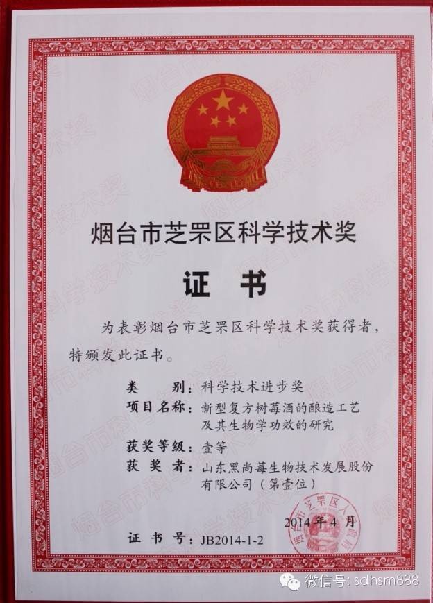 本次获奖,表明我公司的复方树莓酒及其酿造技术得到了权威科技部门的认可,同时也是对我公司建立的“烟台市树莓工程技术研究中心”科技研发能力的肯定。奖项评委会认为,“复方树莓酒”的成功研制,不仅为规模化开发树莓资源找到一条可行的生物转化路线,更为树莓健康产业发展提供了生动示范。