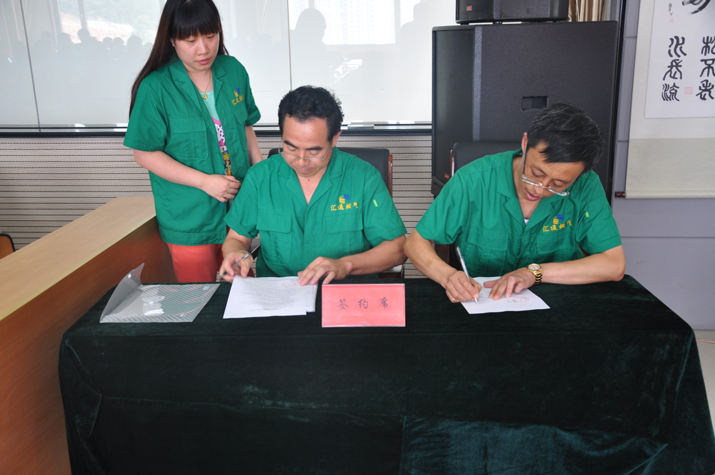 会议期间,徐立光常务副总经理对第十四轮工效挂钩承包工作进行了简短总结,公布了十五轮工效挂钩经济指标并对实施方案进行了解读。公司工会赵国强主席组织参会的员工代表就第十五轮工效挂钩实施方案进行审议,最终62名参会员工代表全部举手审议通过。之后,曹玉亭总经理宣布了新一轮承包期间公司机构设置、人事任免及中层干部任职情况,并与分管销售、安装产业的公司领导及相关部门负责人签订了目标责任状。机关科室代表高锋、销售部门代表唐矛佐、安装部门代表王殿伟、党员代表于金平等四名同志代表公司各部门及全体干部员工进行了发言,表达了公司全体干部员工努力做好十五轮承包工作的决心。