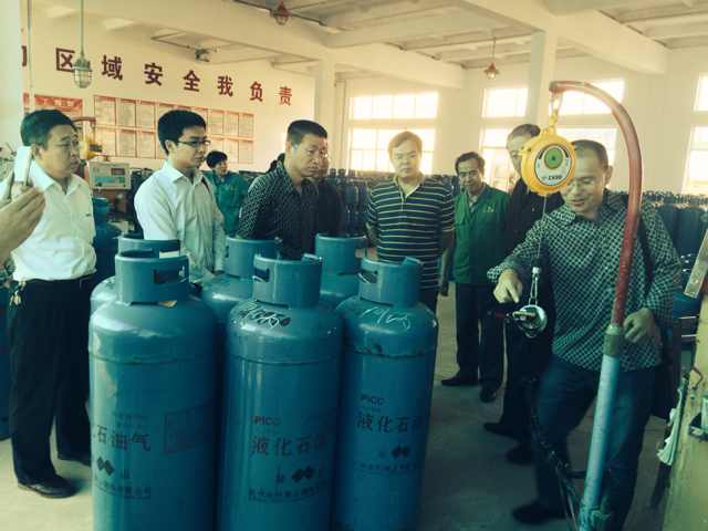 2014年9月23日,山东省质量技术监督局特种设备安全监察处张平处长、烟台市质量技术监督局刘海滨副局长、烟台市特种设备检验研究院李培中院长等省市领导到我公司娄子山储灌站考察指导液化气智能钢瓶置换报废钢瓶工作。