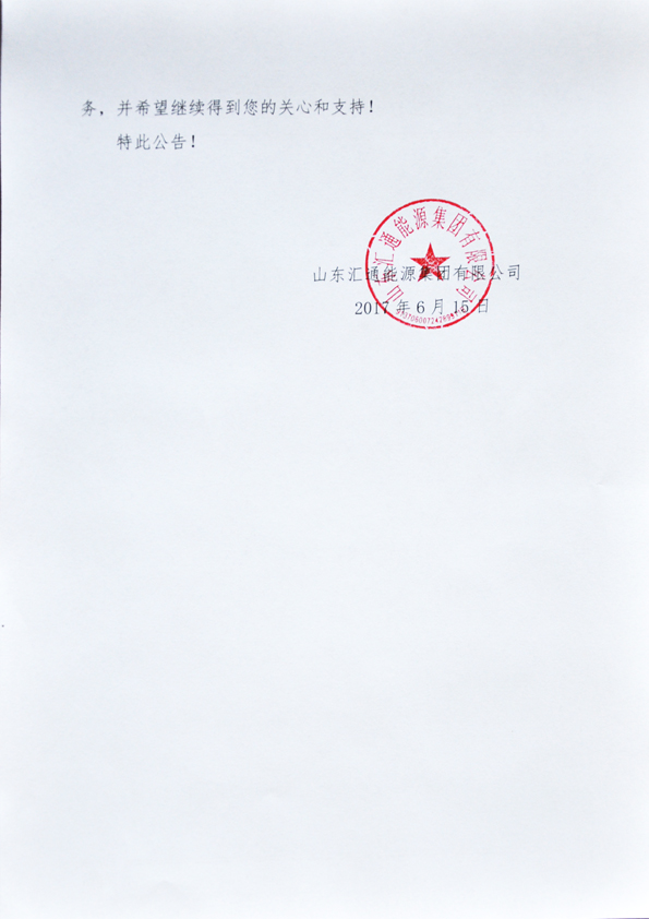 “山东汇通能源集团有限公司”的公告